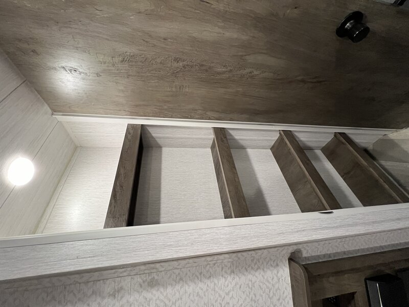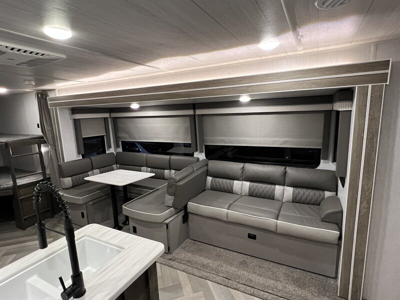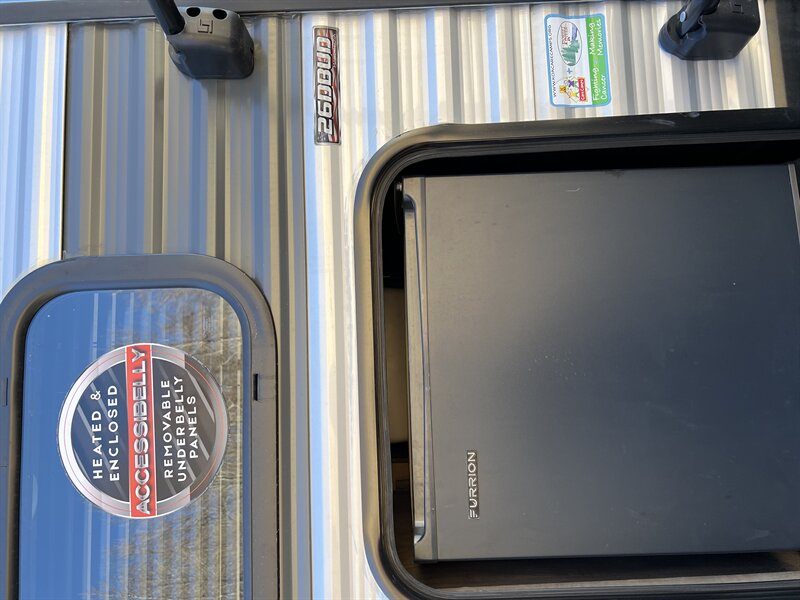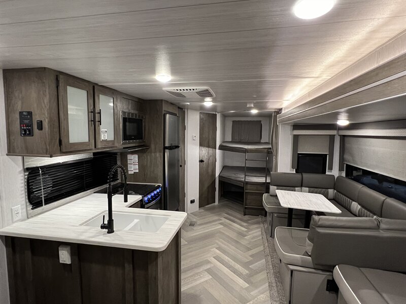 The 26DBUD is the perfect family travel trailer, with double bunks at one end and a queen bedroom at the other. You also get a fireplace (heater), full kitchen with glass-fronted cabinetry and large pantry, a U-dinette, and the customizable Versa-Lounge with Stow N Go Storage.