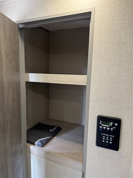 - A refrigerator (12V/110V/propane-capable depending on the model configuration) is factory-installed and placed for convenient access from the living area.
