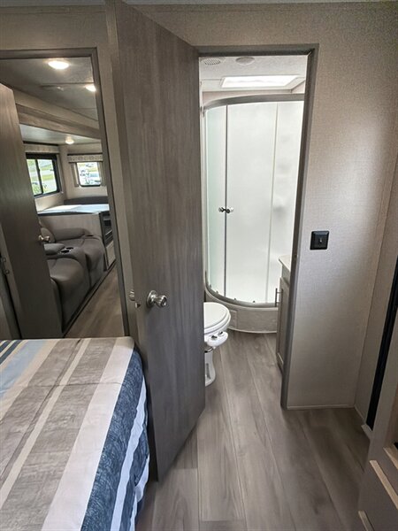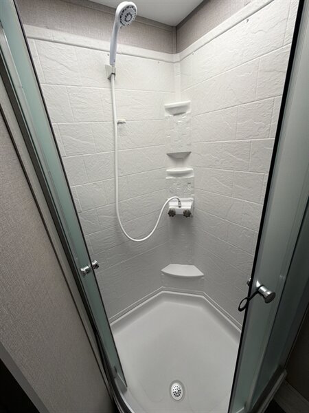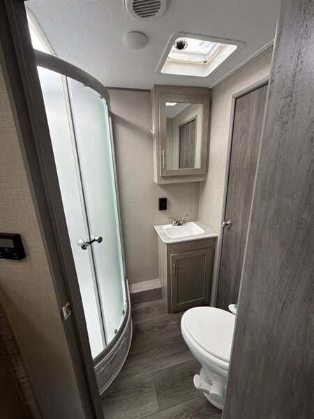 - A full bathroom with a shower and skylight, lavatory with medicine cabinet and storage, and a foot-flush or porcelain toilet is included. The shower typically features a textured floor and a glass or molded enclosure for easy cleaning.