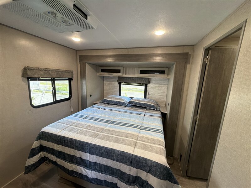 - The master bedroom in the 263FKDS includes a residential-style queen mattress on a fixed or lift-up bed base, bedside wardrobes, overhead storage, and reading lights.